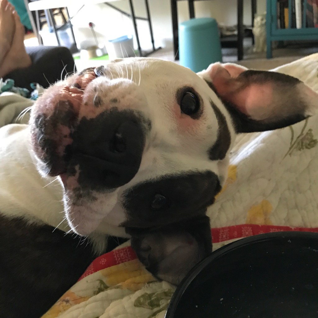 Every time my body does something unexpected or scary -like my new idiopathic angioedema attacks- she’s right there. She doesn’t judge me when I am too sick to shower. She doesn’t question “how sick I really am.” She truly knows me and my broken body better than I know myself. She lends her body as a sturdy support when I need to stand up from the ground or when I get dizzy and need something to lean on. She doesn’t ask for anything in return other than snuggles and love. If I’m sleeping, she’s sleeping. If I’m awake, she’s awake. She tries to snuggle the pain away every day and even reminds me when it’s time for the rats to get more food or she needs to take her medicine (she takes supplements for her joints). When I’m out places and my POTS causes me to get over stimulated or things are too loud she calms me. Most people don’t notice the subtle things she does for me. They don’t know that she lays her head on my lap in public when I’m stressed. Or how she sits directly on my feet in stores or elevators so the pressure helps my circulation so I don’t faint. Or the way she headbutts my knee to tell me that I need to sit down immediately to avoid a fainting episode. Or how she walks nicely beside my wheelchair (even though she was once terrified of baby strollers). When she wears her service vest she knows play time is over and it is time to work. You may notice when she gets upset if I ignore her alerts for too long. She whimpers and then barks until I do as she says. She’s not being bad or acting out, she’s doing her job. She’s telling me that I need to listen to her so I don’t end up injured or worse.