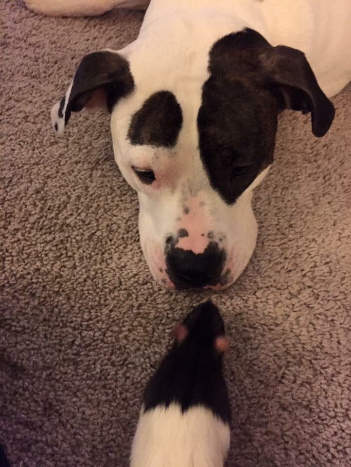It was immediately obvious that she had pretty severe abandonment and separation anxiety. Her first experience in her crate while Kyle and I were both at work did not go well. She used her strength and her forehead to smash, bend, and break the door off the crate in an attempt to find us. I came home to quite the mess and we learned crating was not going to work. Her first trip to the vet a few days after adoption showed that she had severe yeast infections in her nail beds from chewing on them so much due to anxiety, a severe UTI, A LOT of allergies and that she was quite underweight. I think she spent most of those first six months with us on some type of antibiotic. When I say she was afraid of everything, I mean everything. Balloons, loud noises, baby strollers -those first few months we would have to cross the street if a baby stroller was coming because she would cower in fear! She did not like most men (other than Kyle). My poor brother in law babysat Addie one day while I was working and she did nothing but bark at him for FOUR hours straight. Her former adopter was a large man so we think it stems from that. She is good with most men now unless she is left alone with them. But she will not react or bark at anyone if she has her vest on or is working for me.