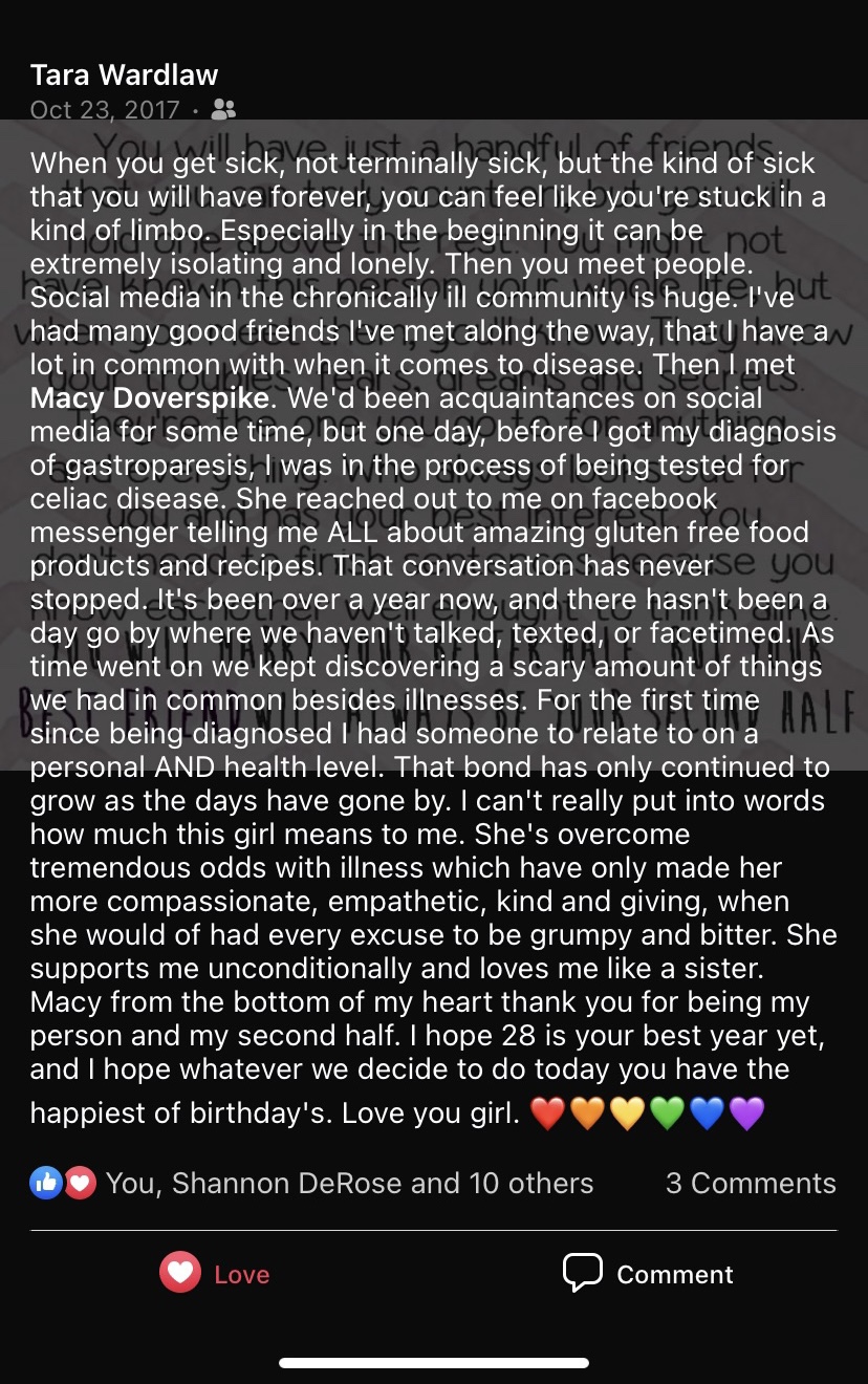 So what do you do when the same thing that brought you together is also the thing that takes them away? When the illness that first caused you to add them as a friend is the reason they are no longer here. The diseases you shared and bonded over and that led to this beautiful friendship causes their death. Your heart breaks. You suddenly have to adjust to a whole new normal. There is no longer a person on the other side of that messenger app to respond to all your random messages. Your heart breaks for the family that you know they loved so much but had no choice but to leave behind. Your heart breaks because you watched them battle so fiercely but that fight doesn’t seem to matter. You get mad because they are supposed to be here now. They are supposed to be here with you battling these diseases. You get mad because they deserved so much better. They deserved so many more years of life. They deserved to have the chance to accomplish all the things they planned. Their family deserved so much more time with them. Their family who fought beside them and never gave up. It’s not fair. You get mad that you have to watch your friend be buried because medical research hasn’t been able to find a cure for these rare diseases. She is only one of so many young chronically ill patients dying because no one has any treatments. You get mad that these diseases managed to take yet another thing from your life. You question everything. Why her? Why now? She tried all the treatments options given to her, experimental and otherwise. She fought and fought and fought for a better quality of life. You become scared. It’s hard now to not constantly worry that you could lose another friend at any moment to these diseases because you never expected to lose her so suddenly. It’s hard not to consider that it could have been you. It’s hard to not be the overbearing friend constantly checking up on your friends. It’s also hard to stop yourself from pushing certain friendships away because you wonder if it’s better to protect yourself so you don’t have to feel the pain again. But you’ve watched so many in the spoonie community pass away and it will take time for that anxiety and fear to lessen. You just have to make sure to enjoy them now. Enjoy the friendship you have and the blessings that friendship brings to your life.